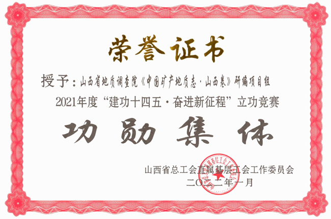日前,地調(diào)院有限公司獲得山西省總工會直屬基層“2021年度‘建功十四五·奮進新征程’立功競賽”“功勛集體”榮譽稱號。
