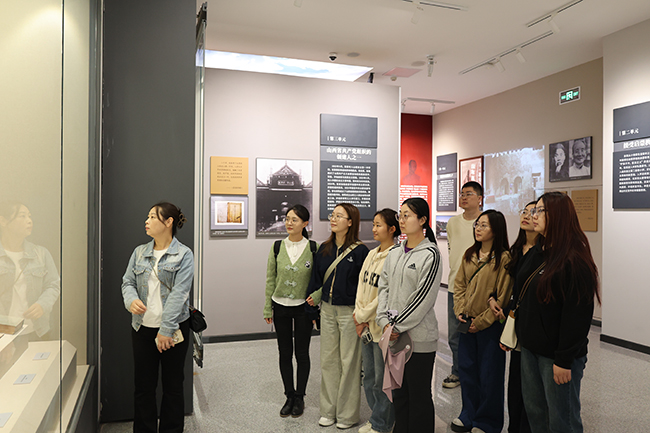 在講解員的引導(dǎo)下,團(tuán)員青年們依次參觀了 "革命先驅(qū)"" 太原火種 ""抗戰(zhàn)烽火"" 建設(shè)歲月 "四個(gè)主題展廳。通過(guò) 300 余幅歷史照片、120 余件文獻(xiàn)實(shí)物、6 組場(chǎng)景復(fù)原,系統(tǒng)回顧了彭真同志從太原省立一中求學(xué)青年成長(zhǎng)為黨和國(guó)家領(lǐng)導(dǎo)人的奮斗歷程,重點(diǎn)呈現(xiàn)了 1924 年中共太原支部成立這一開(kāi)天辟地的歷史時(shí)刻。在" 中共太原支部成立 " 復(fù)原場(chǎng)景前,青年們駐足凝視,仿佛穿越回 1924 年那個(gè)熱血沸騰的年代 —— 高君宇、賀昌、彭真等革命先驅(qū)在省立一中秘密集會(huì),宣告山西第一個(gè)黨組織誕生的歷史畫(huà)面。