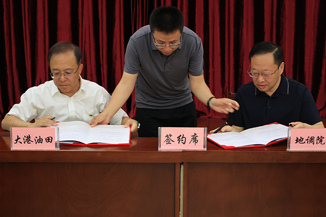 儀式上,在雙方與會(huì)人員的共同見證下,地調(diào)院有限公司董事長(zhǎng)李愛民和大港油田公司經(jīng)理孫澤新,代表雙方現(xiàn)場(chǎng)簽訂合作協(xié)議。