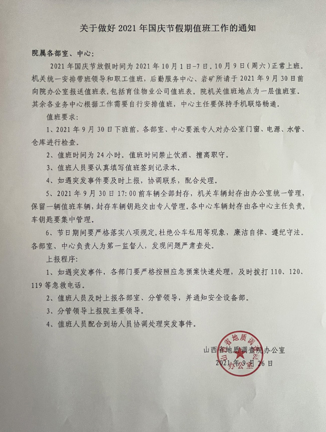 關于做好2021年國慶節(jié)假期值班工作的通知