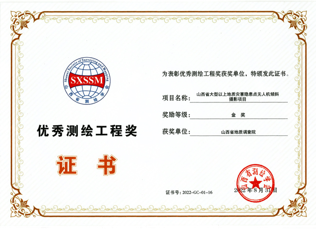 地調(diào)院有限公司測繪地理信息技術(shù)研究院承擔(dān)的《山西省大型以上地質(zhì)災(zāi)害隱患點無人機傾斜攝影》項目獲得2022年度優(yōu)秀測繪工程獎金獎。