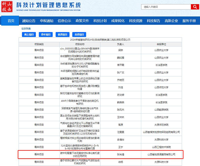 近日,山西省科技廳正式揭曉2024年度基礎(chǔ)研究計劃 (自由探索類) 項目評審結(jié)果,全省529個獲批項目多花落于高校與科研院所,企業(yè)獲資助寥寥,僅7家企業(yè)有幸躋身其中,而山西省地質(zhì)調(diào)查院有限公司憑借張尚清博士申報的 “碳中和背景下赤泥復(fù)合材料凈化有機廢水的應(yīng)用研究” 項目,成功斬獲資助名額,一舉打破公司在山西省自然科學(xué)基金項目申報上長久以來的 “零記錄”。