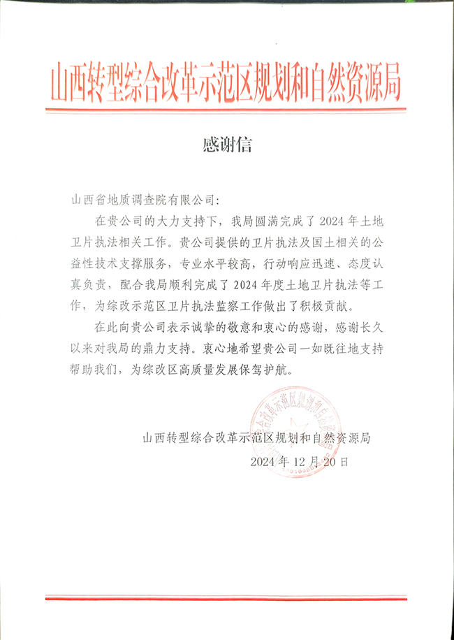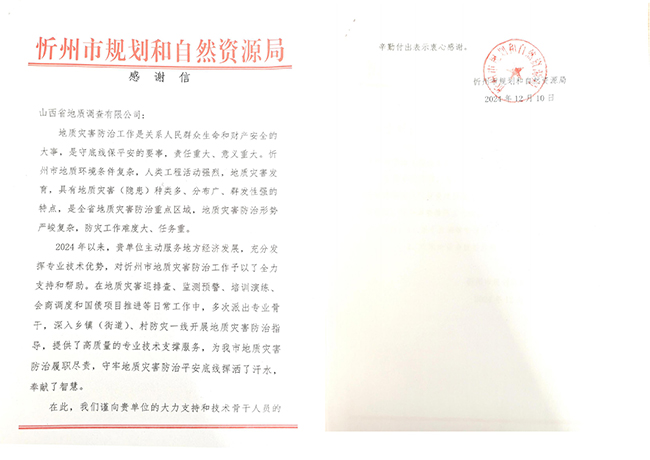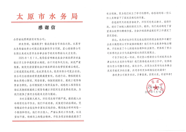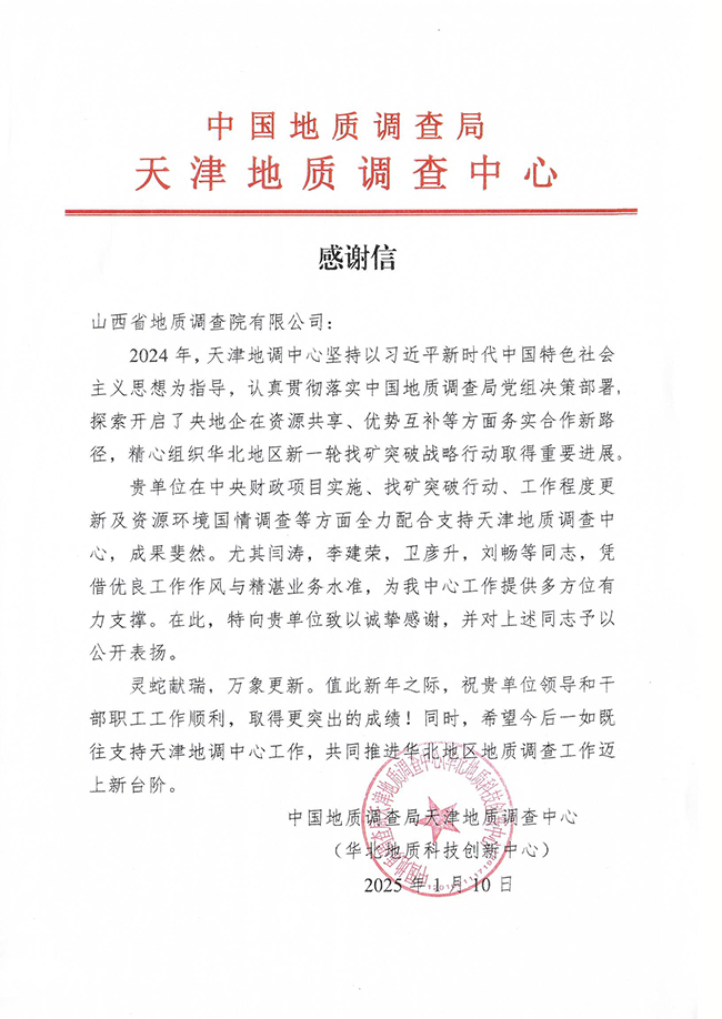 近期,公司收到來自政府、地方以及行業(yè)部門等多方的感謝信,信中均對地調(diào)院有限公司專業(yè)能力、人才實(shí)力與社會責(zé)任感給予了高度贊揚(yáng)。